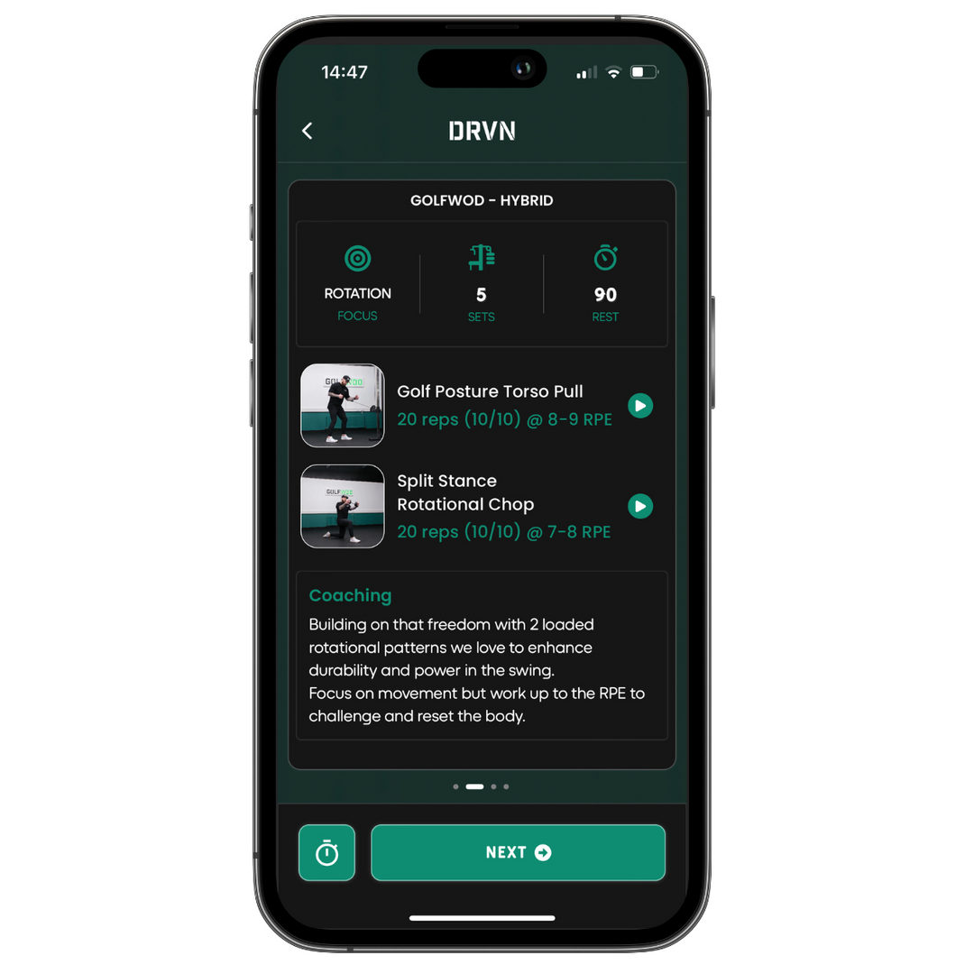 Train for Golf and for Life with the best Workouts in Golf in the DRVN App with programs designed for the Golf Season. This Plan builds confidence, consistency and progress into how you work on your Health and Fitness and how you work on your Golf Swing! We do the Work, you just follow the Program!